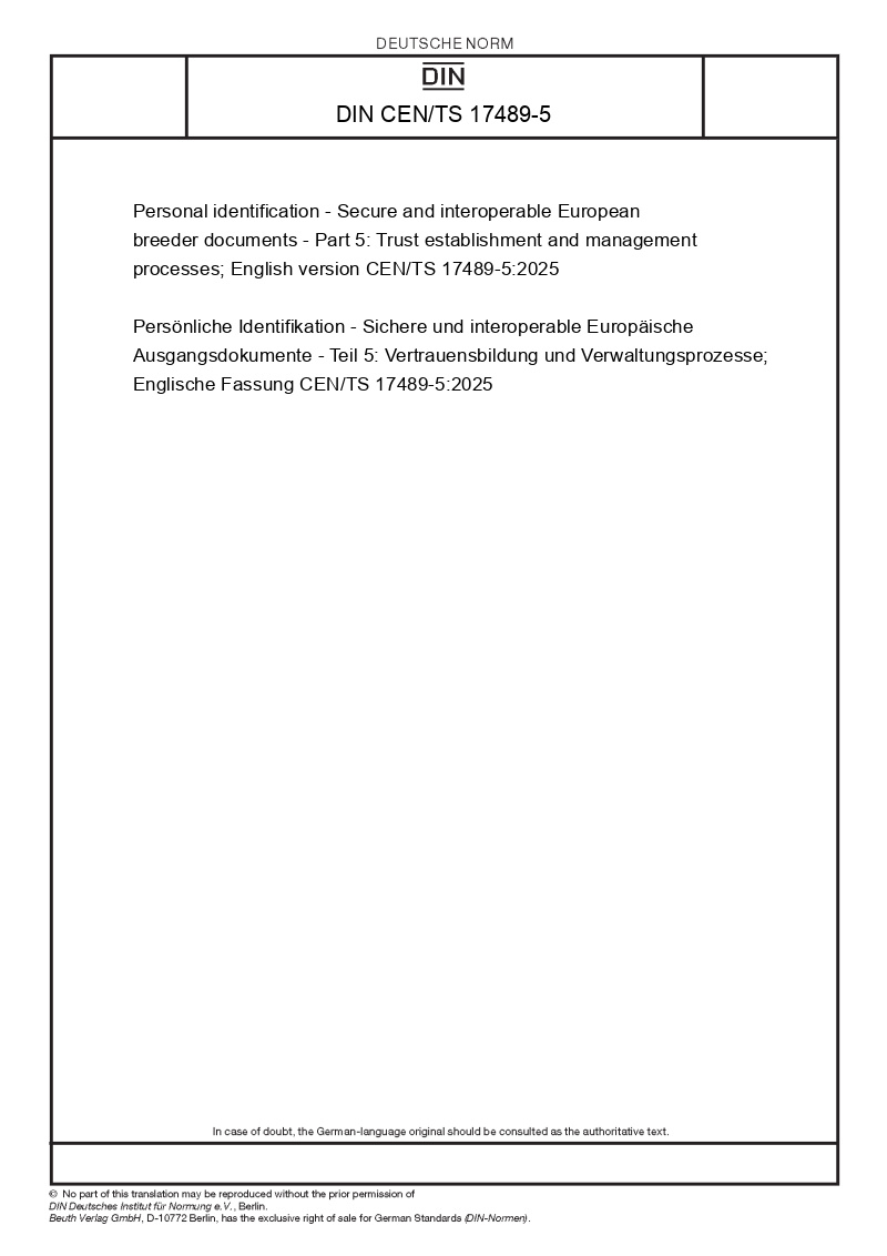 Personal identification - Secure and interoperable European breeder documents - Part 5: Trust establishment and management processes; English version CEN/TS 17489-5:2025