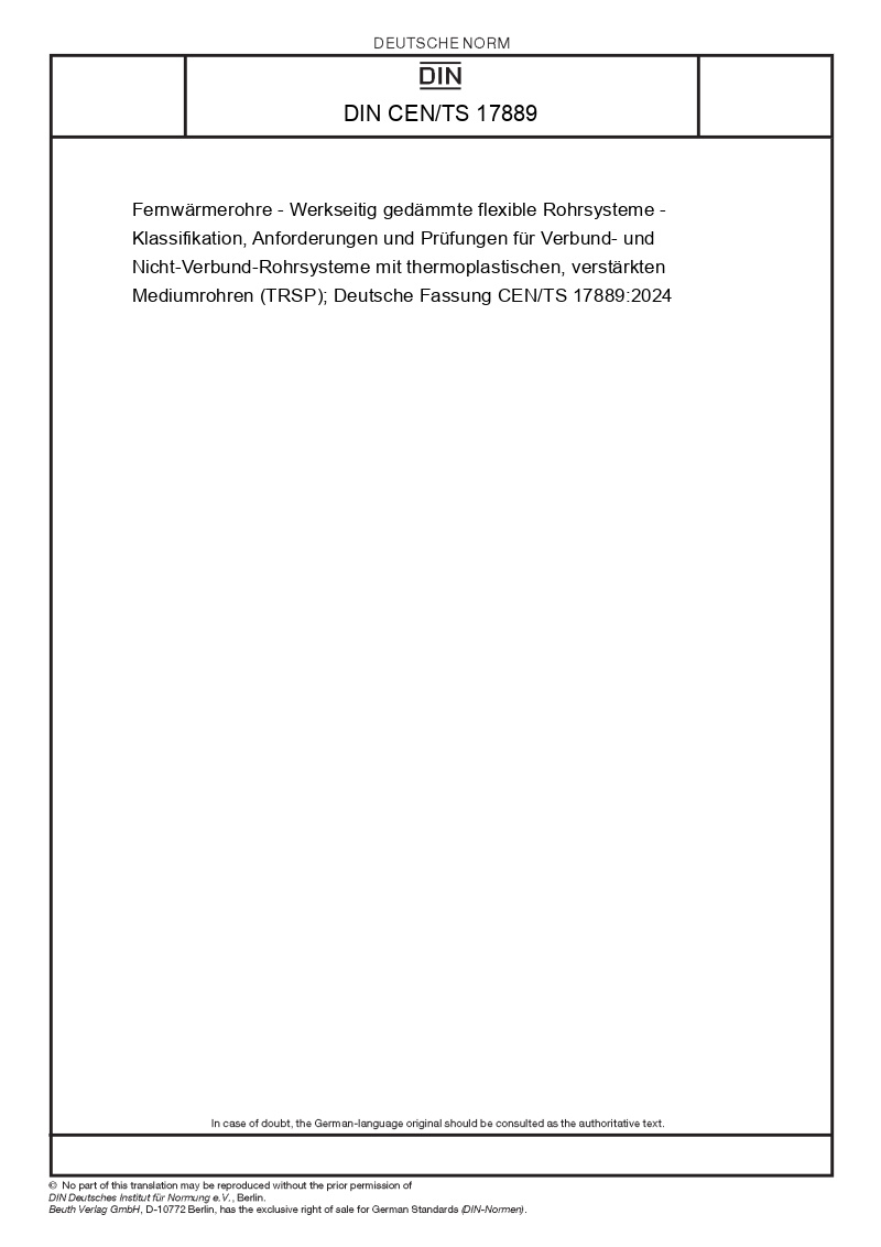 | Name: | Fernwärmerohre - Werkseitig gedämmte flexible Rohrsysteme - Klassifikation, Anforderungen und Prüfungen für Verbund- und Nicht-Verbund-Rohrsysteme mit thermoplastischen, verstärkten Mediumrohren (TRSP); Deutsche Fassung CEN/TS 17889:2024 |