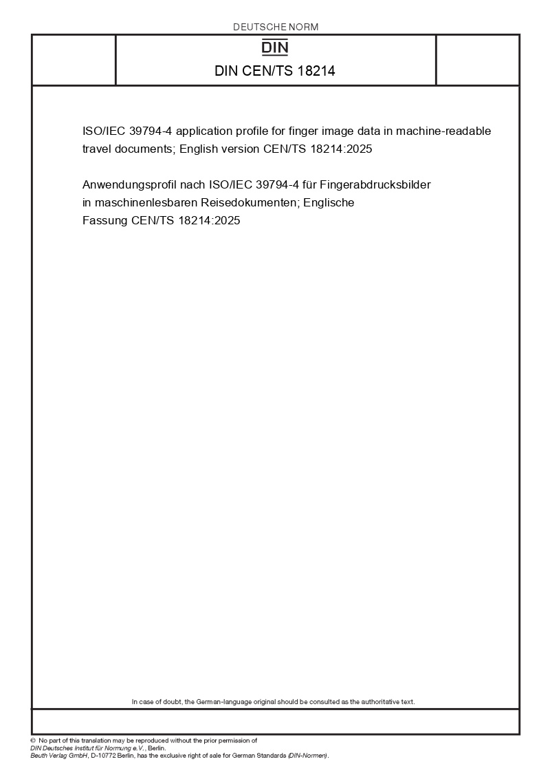 Anwendungsprofil nach ISO/IEC 39794-4 für Fingerabdrucksbilder in maschinenlesbaren Reisedokumenten; Englische Fassung CEN/TS 18214:2025