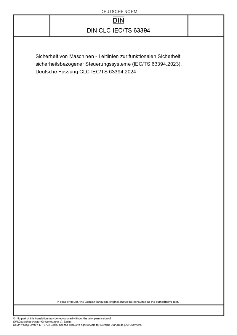 | Name: | Sicherheit von Maschinen - Leitlinien zur funktionalen Sicherheit sicherheitsbezogener Steuerungssysteme (IEC/TS 63394:2023); Deutsche Fassung CLC IEC/TS 63394:2024 |