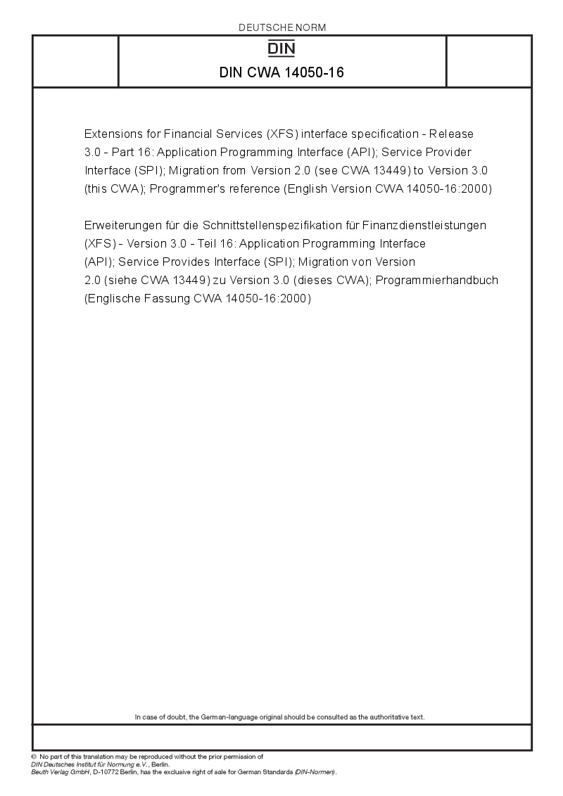 | Name: | Extensions for Financial Services (XFS) interface specification - Release 3.0 - Part 16: Application Programming Interface (API); Service Provider Interface (SPI); Migration from Version 2.0 (see CWA 13449) to Version 3.0 (this CWA); Programmer's reference (English Version CWA 14050-16:2000) |