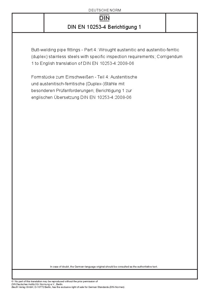 Name:Butt-welding pipe fittings - Part 4: Wrought austenitic and austenitic-ferritic (duplex) stainless steels with specific inspection requirements; Corrigendum 1 to English translation of DIN EN 10253-4:2008-06
