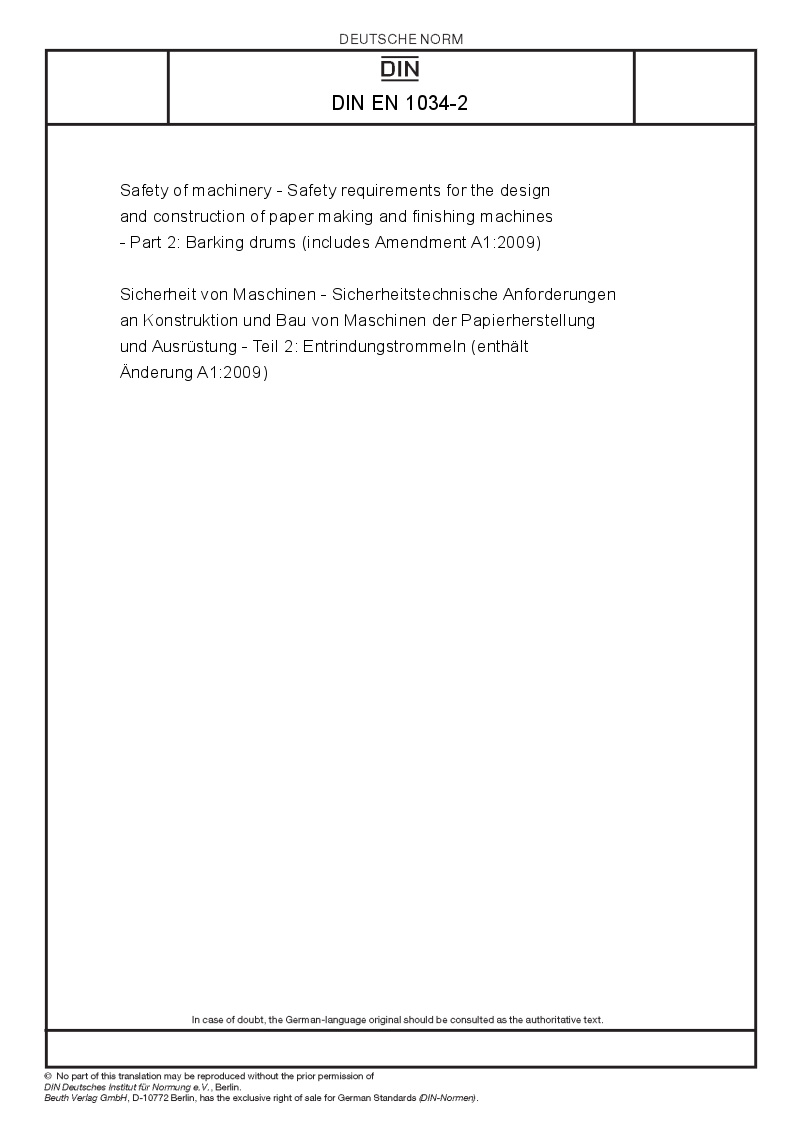 Sicherheit von Maschinen - Sicherheitstechnische Anforderungen an Konstruktion und Bau von Maschinen der Papierherstellung und Ausrüstung - Teil 2: Entrindungstrommeln (enthält Änderung A1:2009)