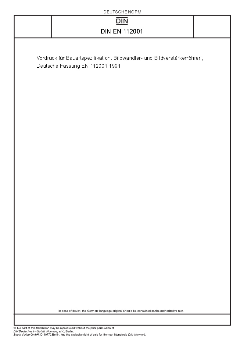 DIN EN 112001 Vordruck für Bauartspezifikation: Bildwandler- und Bildverstärkerröhren; Deutsche Fassung EN 112001:1991in stockReleased: 1993-06