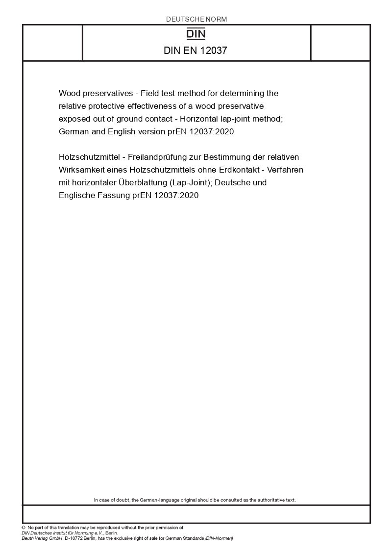 | Name: | Wood preservatives - Field test method for determining the relative protective effectiveness of a wood preservative exposed out of ground contact - Horizontal lap-joint method |