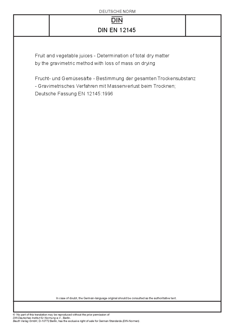 Frucht- und Gemüsesäfte - Bestimmung der gesamten Trockensubstanz - Gravimetrisches Verfahren mit Massenverlust beim Trocknen; Deutsche Fassung EN 12145:1996