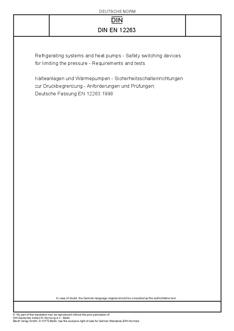 Kälteanlagen und Wärmepumpen - Sicherheitsschalteinrichtungen zur Druckbegrenzung - Anforderungen und Prüfungen; Deutsche Fassung EN 12263:1998