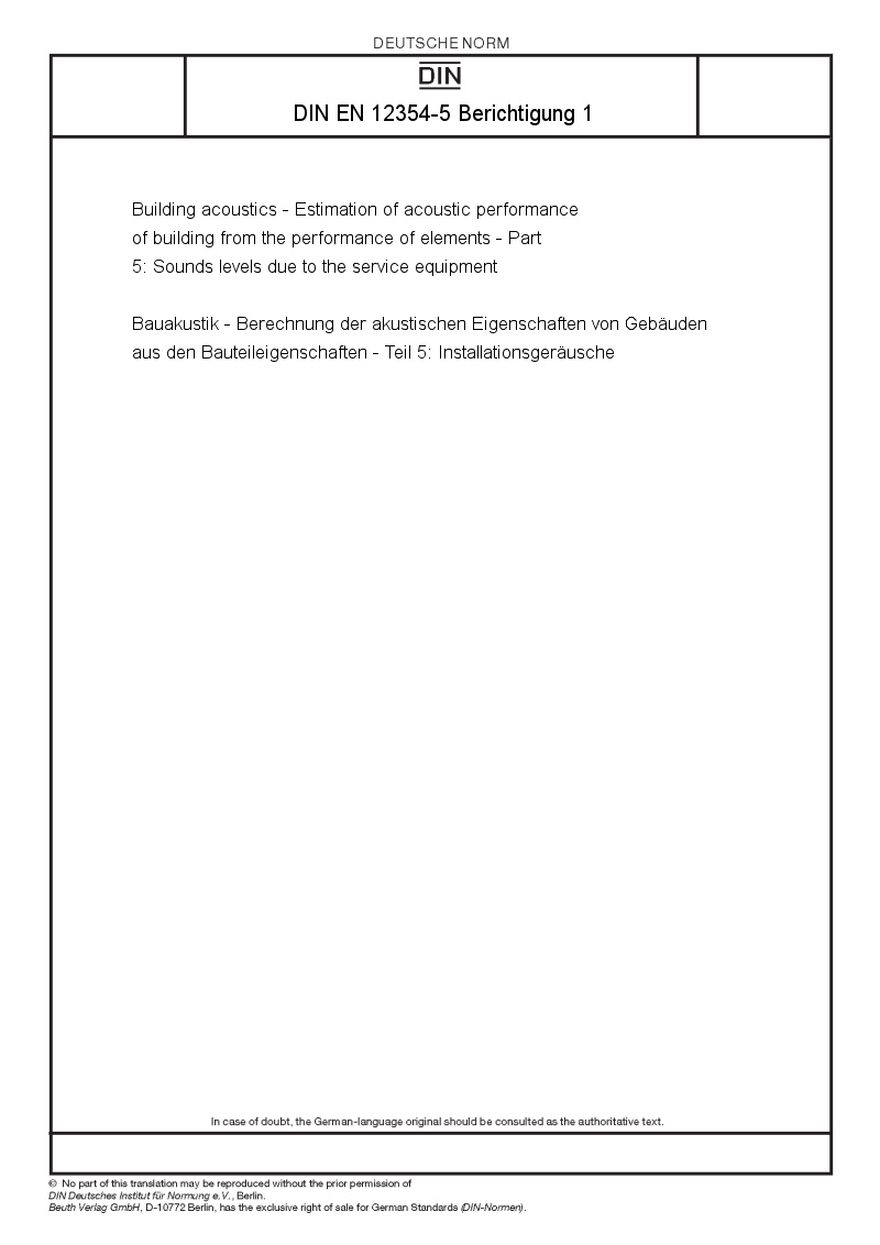 >DIN Standards>DIN EN 12354-5 Berichtigung 1 Building acoustics - Estimation of acoustic performance of building from the performance of elements - Part 5: Sounds levels due to the service equipment