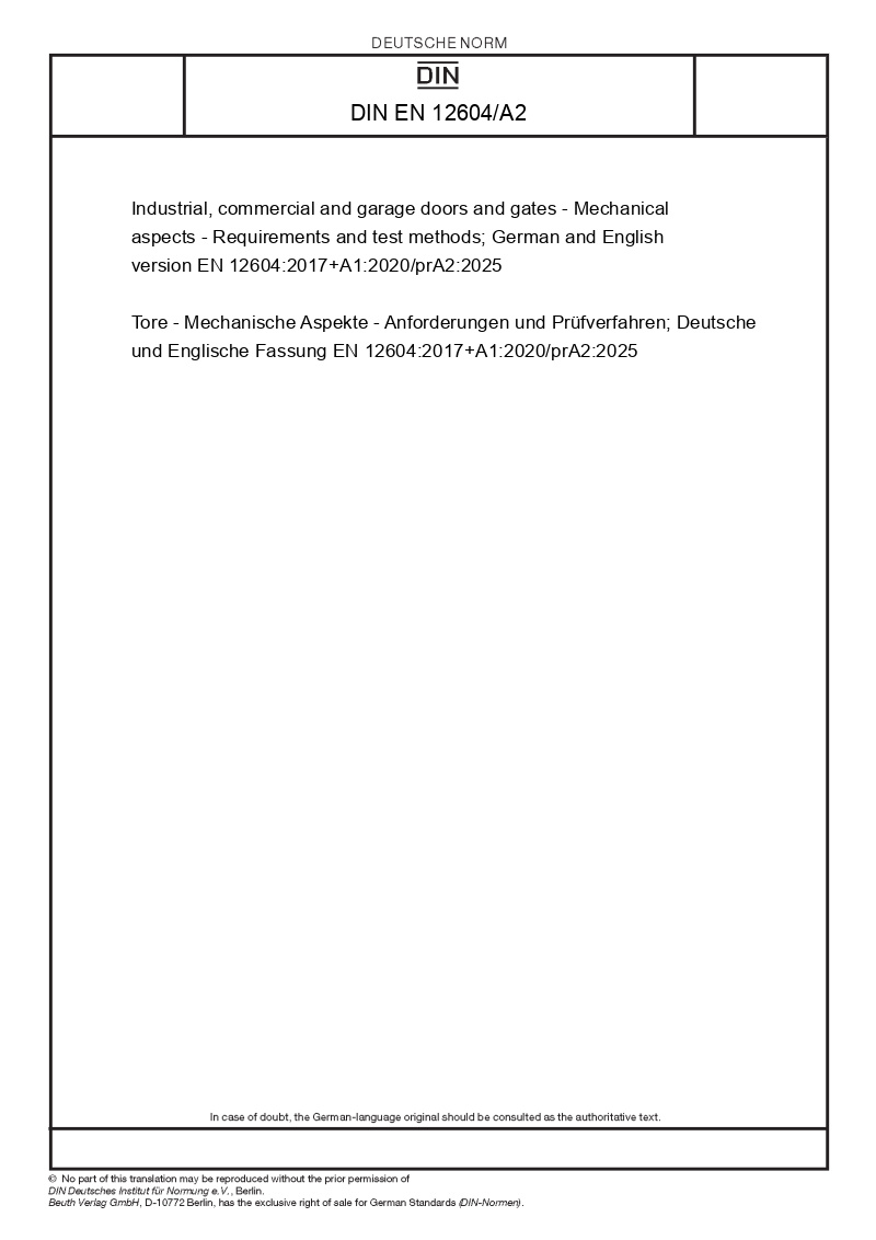 | Name: | Industrial, commercial and garage doors and gates - Mechanical aspects - Requirements and test methods; German and English version EN 12604:2017+A1:2020/prA2:2025 |