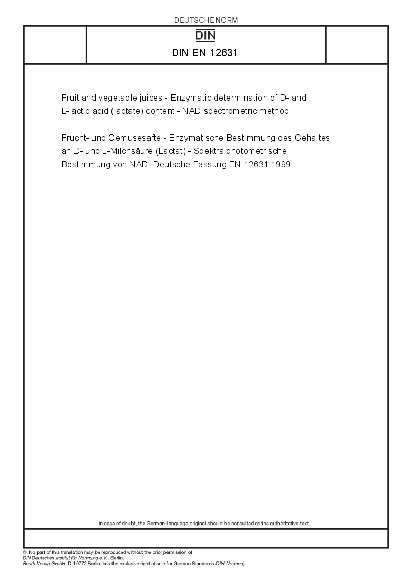 >DIN Standards>DIN EN 12631 Fruit and vegetable juices - Enzymatic determination of D- and L-lactic acid (lactate) content - NAD spectrometric method