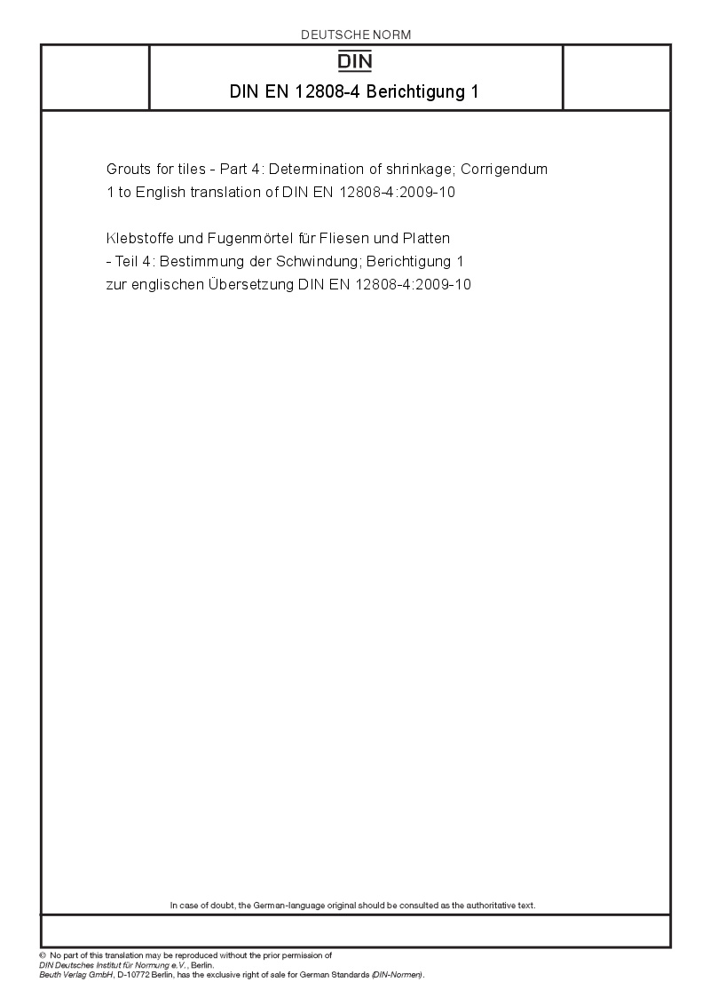 >DIN Standards>DIN EN 12808-4 Berichtigung 1 Grouts for tiles - Part 4: Determination of shrinkage; Corrigendum 1 to English translation of DIN EN 12808-4:2009-10