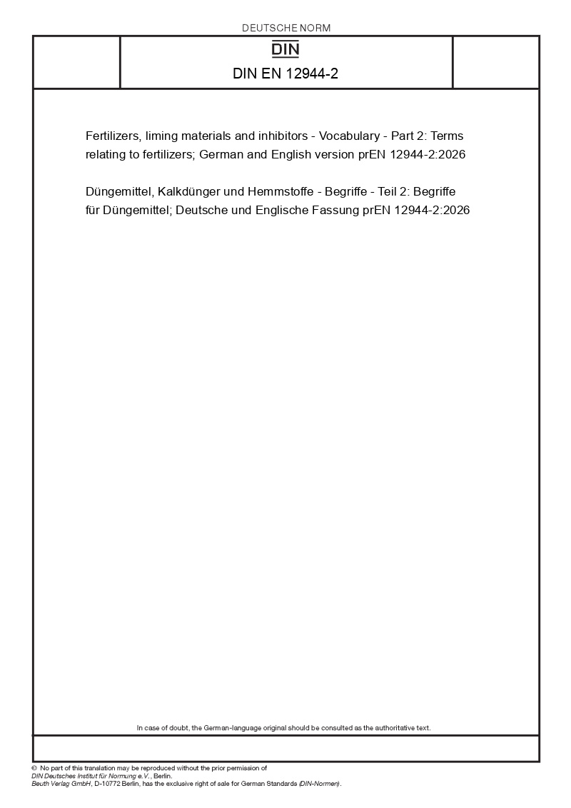 | Name: | Fertilizers, liming materials and inhibitors - Vocabulary - Part 2: Terms relating to fertilizers; German and English version prEN 12944-2:2026 |