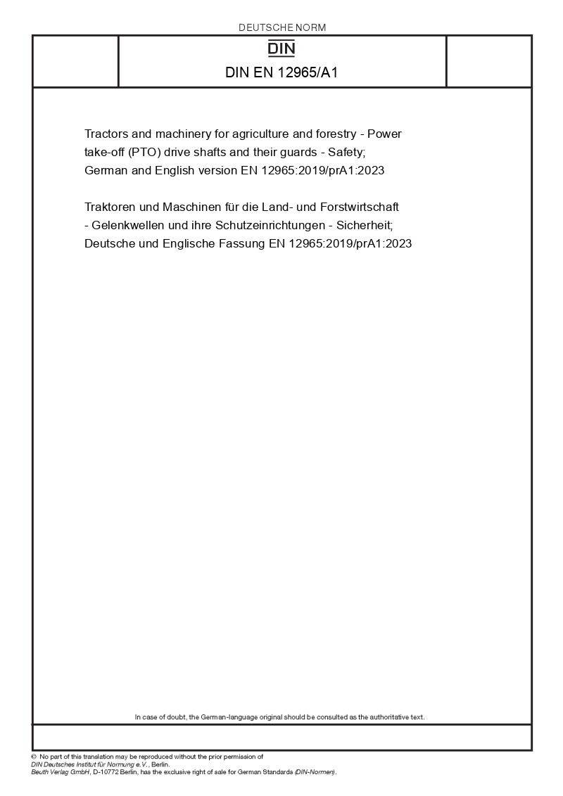 | Name: | Tractors and machinery for agriculture and forestry - Power take-off (PTO) drive shafts and their guards - Safety; German and English version EN 12965:2019/prA1:2023 |