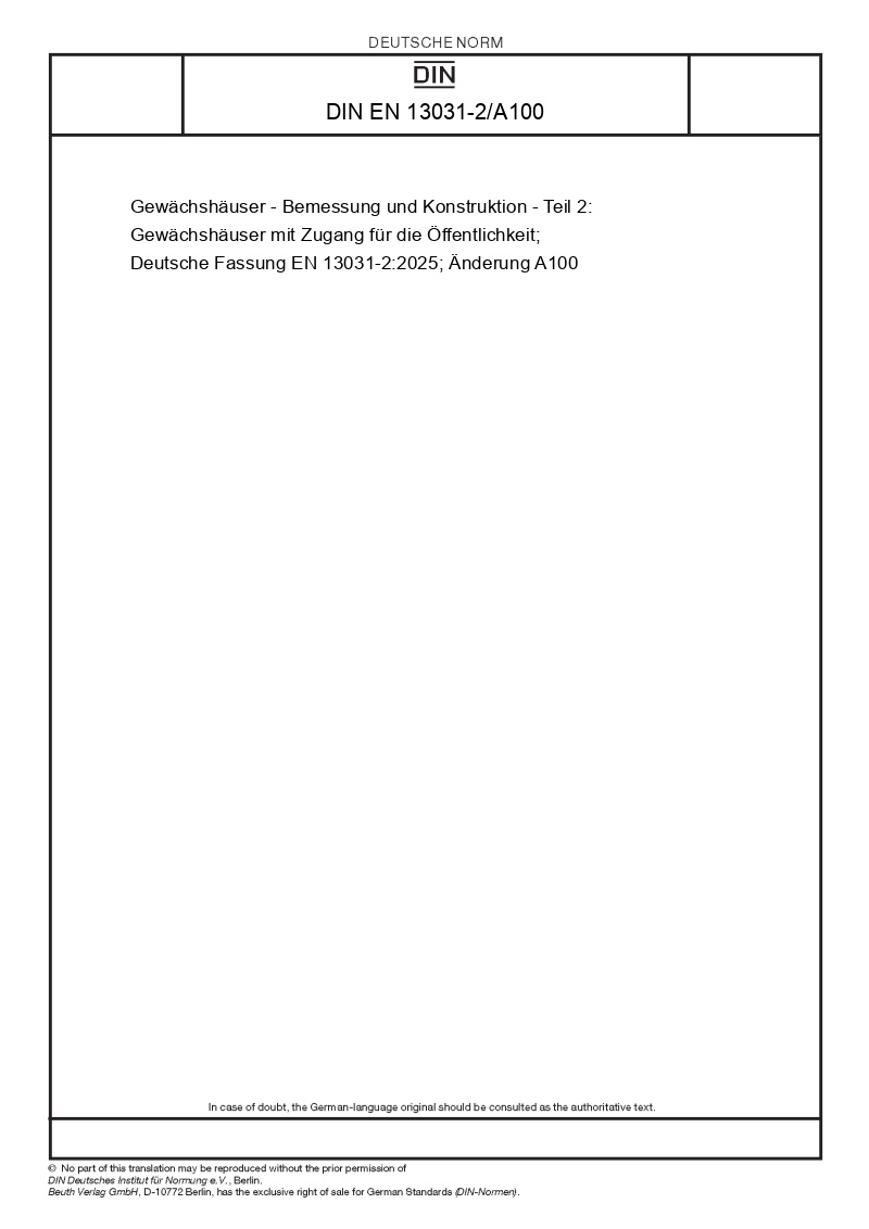 >DIN Standards>DIN EN 13031-2/A100 Gewächshäuser - Bemessung und Konstruktion - Teil 2: Gewächshäuser mit Zugang für die Öffentlichkeit; Deutsche Fassung EN 13031-2:2025; Änderung A100