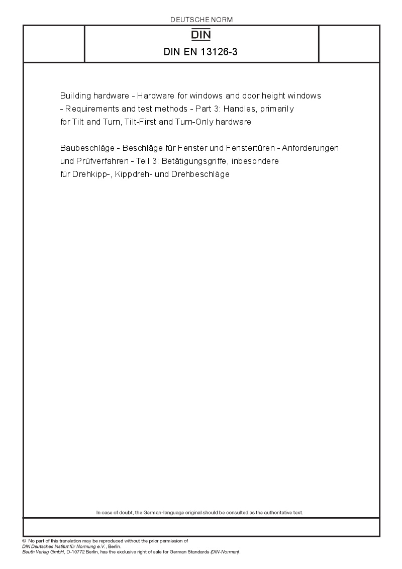| Name: | Building hardware - Hardware for windows and door-height windows - Requirements and test methods - Part 3: Handles, primarily for Tilt and Turn, Tilt-First and Turn-Only hardware |