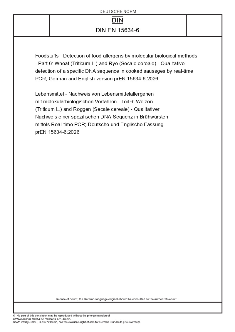 | Name: | Foodstuffs - Detection of food allergens by molecular biological methods - Part 6: Wheat (Triticum L.) and Rye (Secale cereale) - Qualitative detection of a specific DNA sequence in cooked sausages by real-time PCR; German and English version prEN 15634-6:2026 |