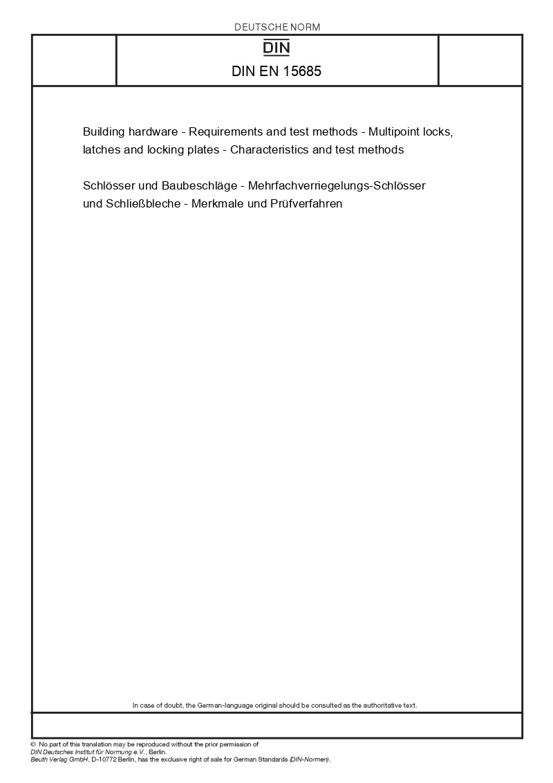| Name: | Building hardware - Requirements and test methods - Multipoint locks, latches and locking plates - Characteristics and test methods |