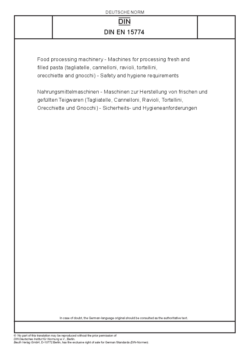 | Name: | Food processing machinery - Machines for processing fresh and filled pasta (tagliatelle, cannelloni, ravioli, tortellini, orecchiette and gnocchi) - Safety and hygiene requirements |