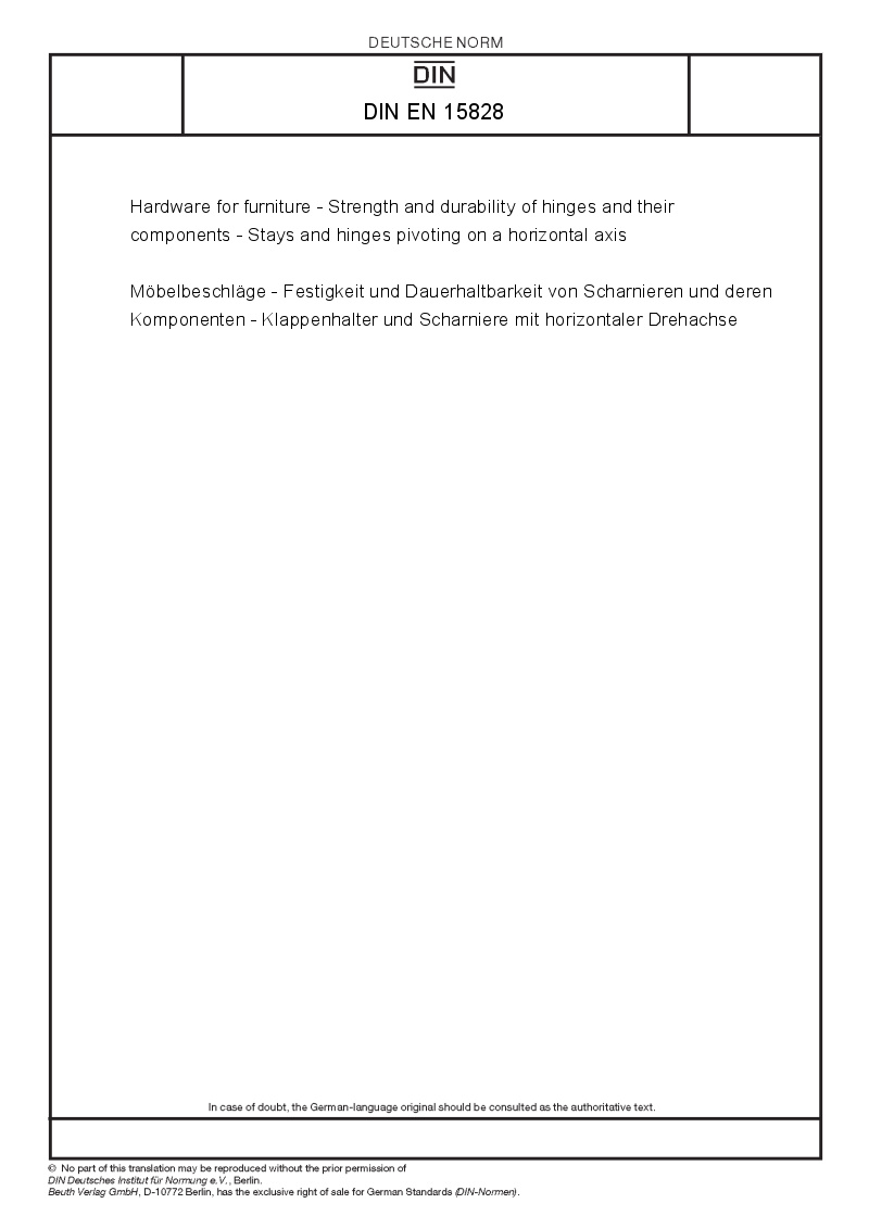 | Name: | Hardware for furniture - Strength and durability of hinges and their components - Stays and hinges pivoting on a horizontal axis |