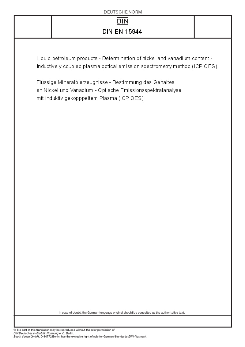Flüssige Mineralölerzeugnisse - Bestimmung des Gehaltes an Nickel und Vanadium - Optische Emissionsspektralanalyse mit induktiv gekopppeltem Plasma (ICP OES)