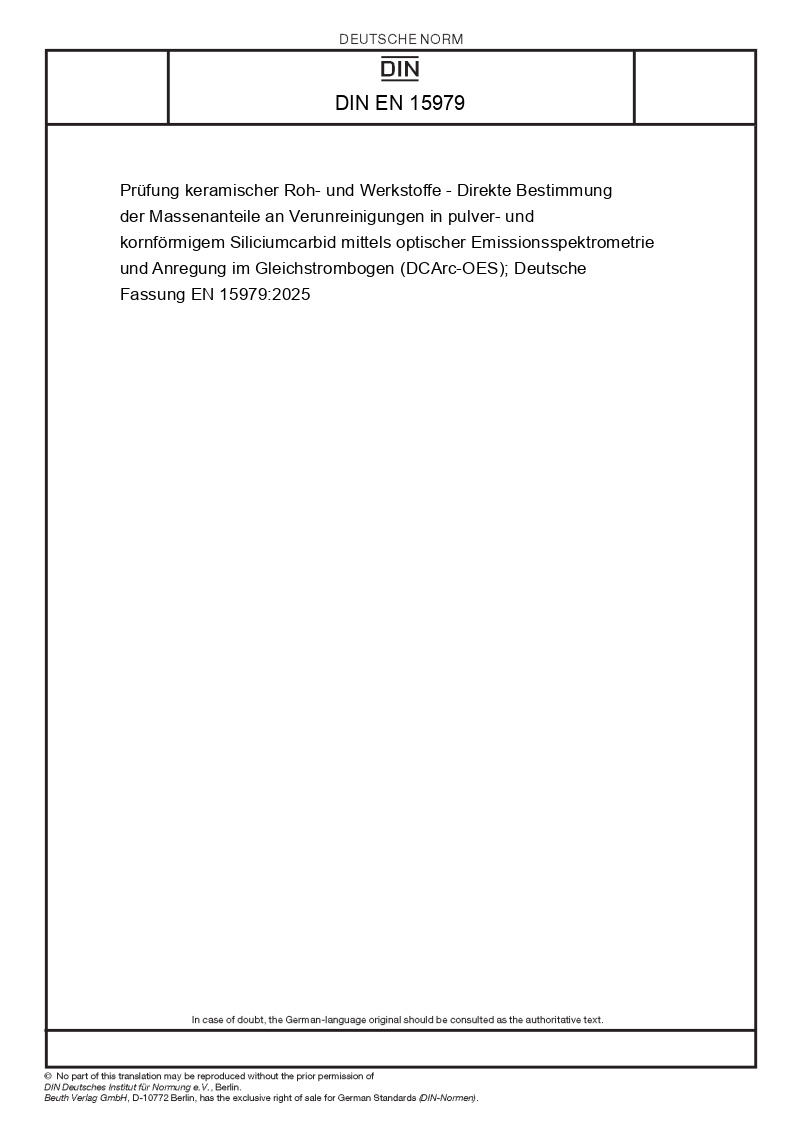 Prüfung keramischer Roh- und Werkstoffe - Direkte Bestimmung der Massenanteile an Verunreinigungen in pulver- und kornförmigem Siliciumcarbid mittels optischer Emissionsspektrometrie und Anregung im Gleichstrombogen (DCArc-OES)