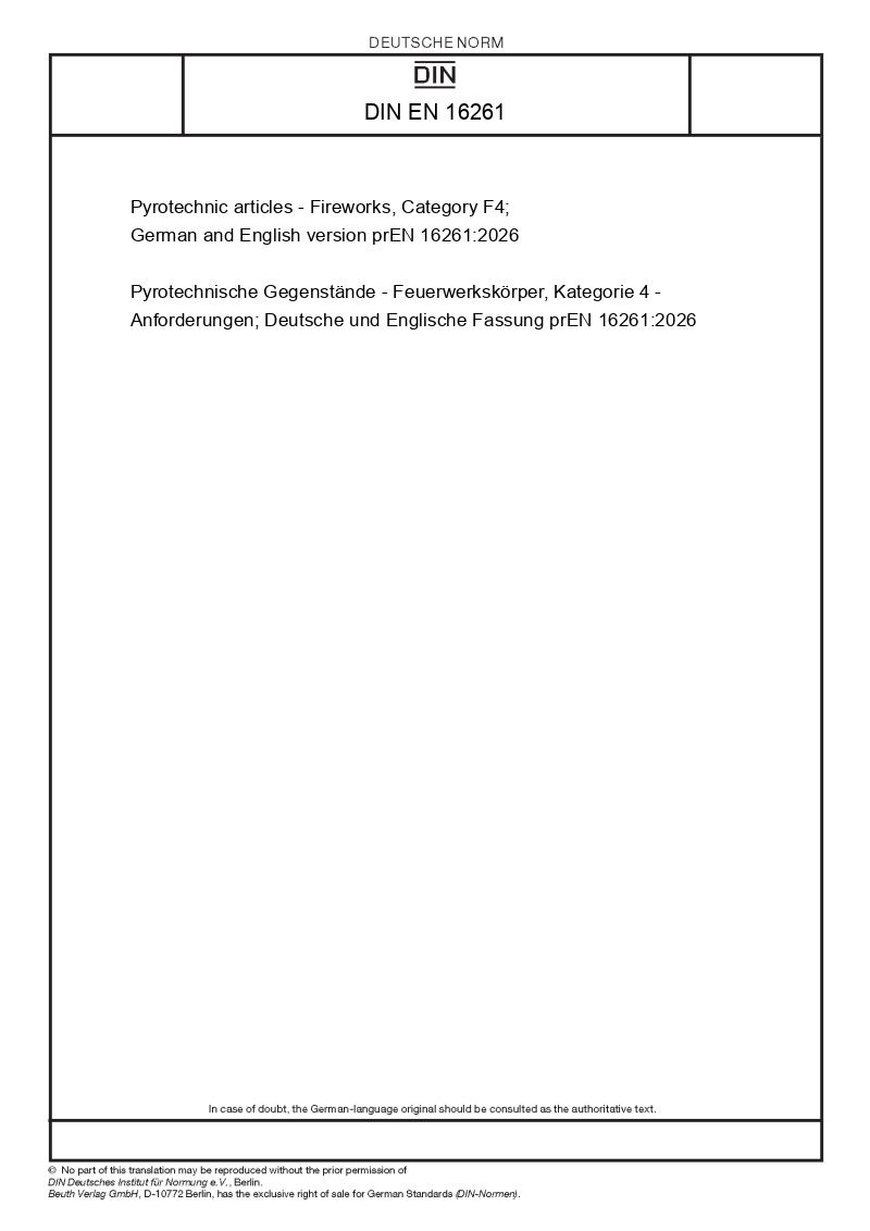 | Name: | Pyrotechnic articles - Fireworks, Category F4; German and English version prEN 16261:2026 |