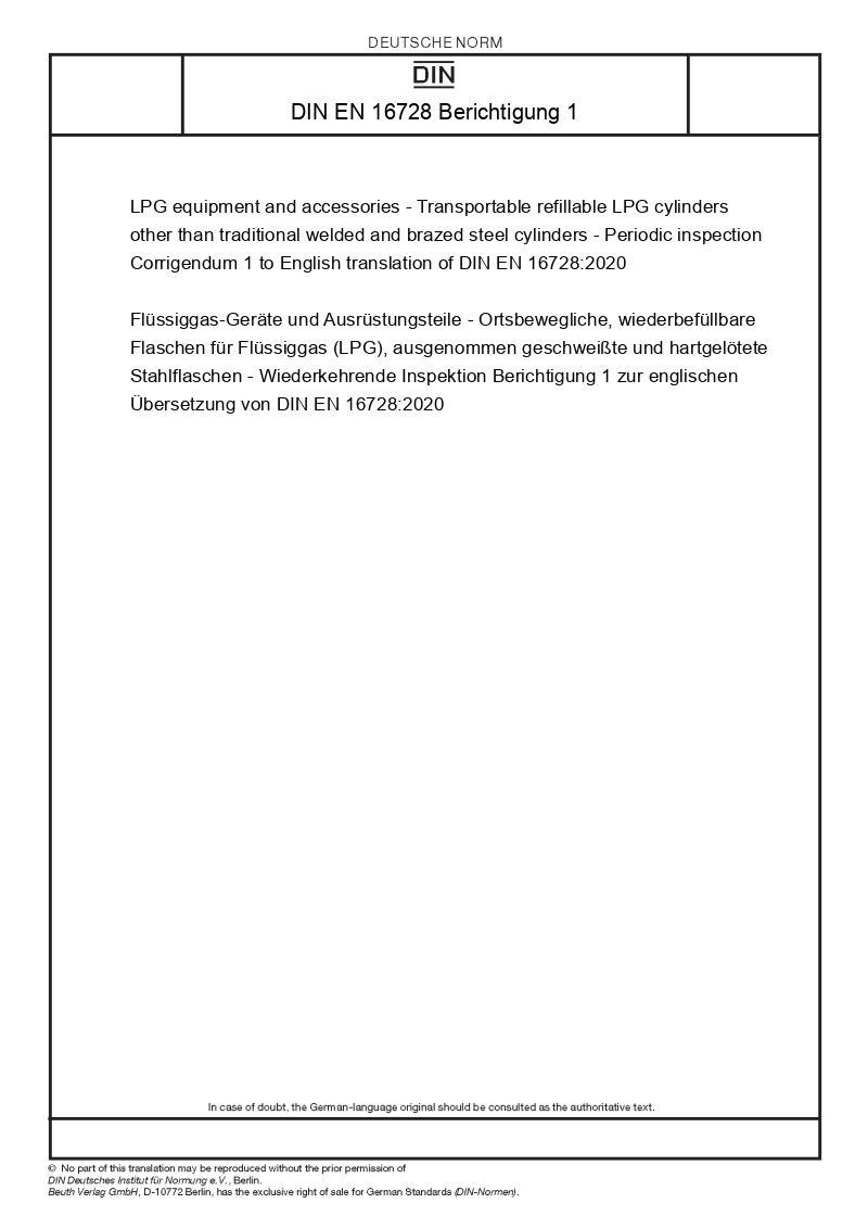 LPG equipment and accessories - Transportable refillable LPG cylinders other than traditional welded and brazed steel cylinders - Periodic inspection Corrigendum 1 to English translation of DIN EN 16728:2020
