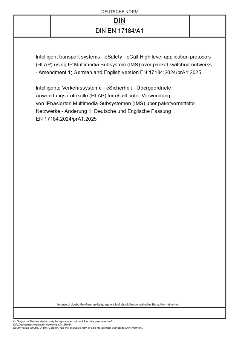 | Name: | Intelligent transport systems - eSafety - eCall High level application protocols (HLAP) using IP Multimedia Subsystem (IMS) over packet switched networks - Amendment 1; German and English version EN 17184:2024/prA1:2025 |