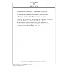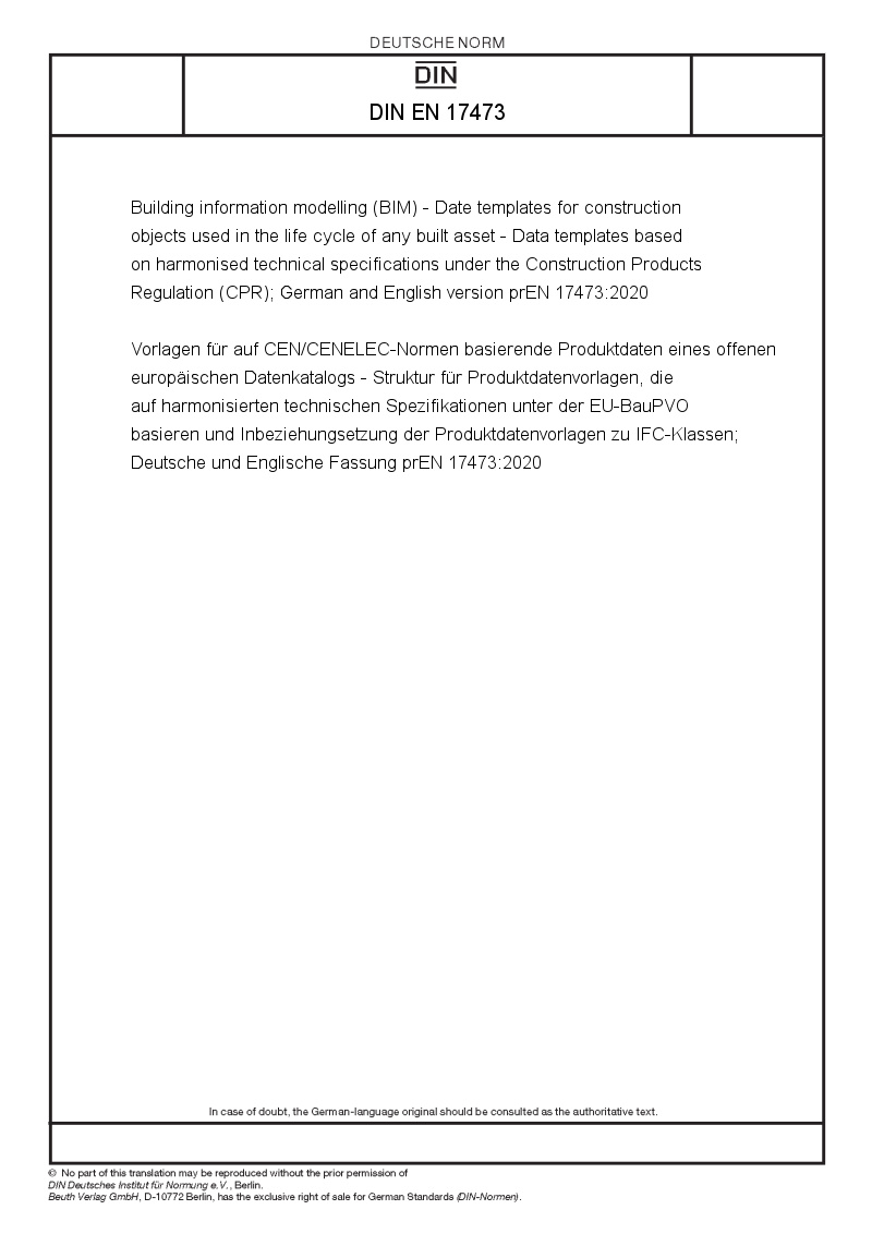 | Name: | Building information modelling (BIM) - Date templates for construction objects used in the life cycle of any built asset - Data templates based on harmonised technical specifications under the Construction Products Regulation (CPR); German and English version prEN 17473:2020 |