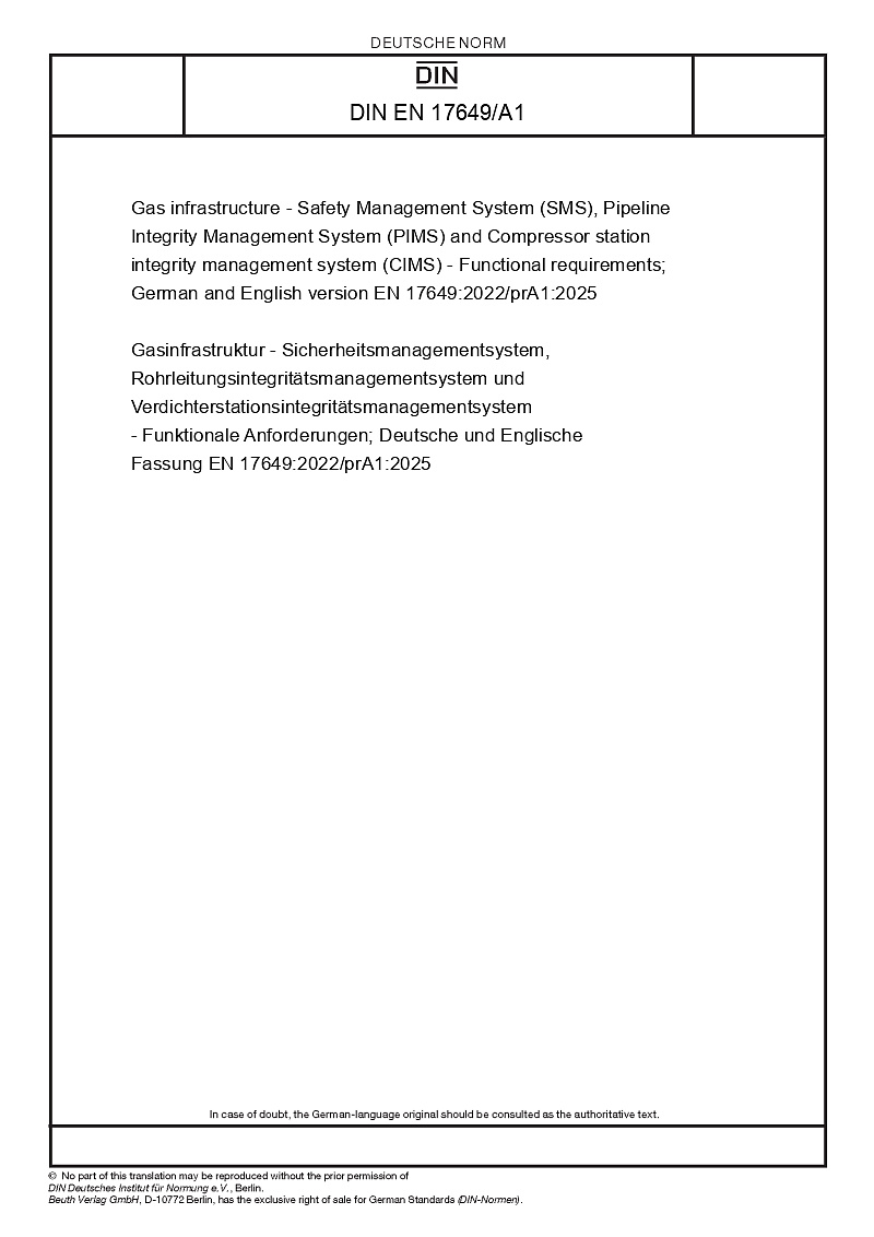 | Name: | Gas infrastructure - Safety Management System (SMS), Pipeline Integrity Management System (PIMS) and Compressor station integrity management system (CIMS) - Functional requirements; German and English version EN 17649:2022/prA1:2025 |