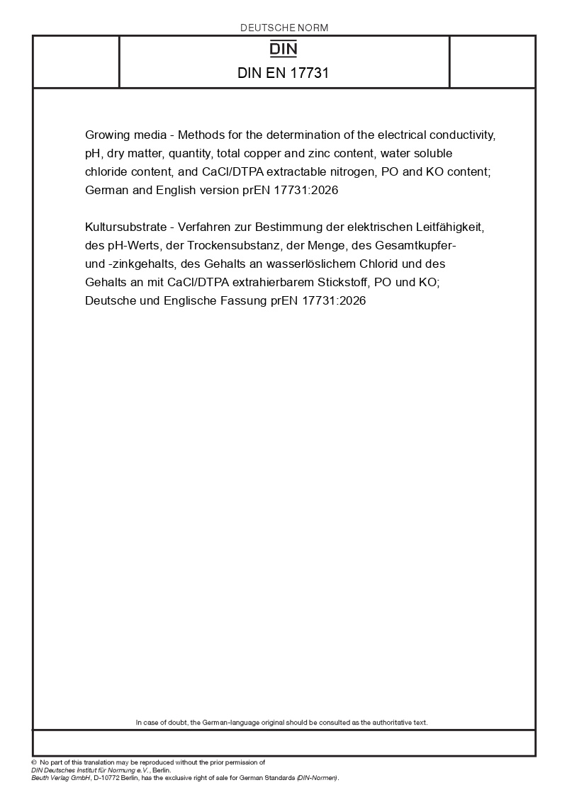 Kultursubstrate - Verfahren zur Bestimmung der elektrischen Leitfähigkeit, des pH-Werts, der Trockensubstanz, der Menge, des Gesamtkupfer- und -zinkgehalts, des Gehalts an wasserlöslichem Chlorid und des Gehalts an mit CaCl<(Index)2>/DTPA extrahierbarem Stickstoff, P<(Index)2>O<(Index)5> und K<(Index)2>O; Deutsche und Englische Fassung prEN 17731:2026