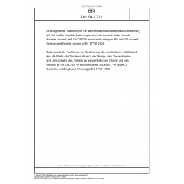 | Name: | Growing media - Methods for the determination of the electrical conductivity, pH, dry matter, quantity, total copper and zinc content, water soluble chloride content, and CaCl<(Index)2>/DTPA extractable nitrogen, P<(Index)2>O<(Index)5> and K<(Index)2>O content; German and English version prEN 17731:2026 |