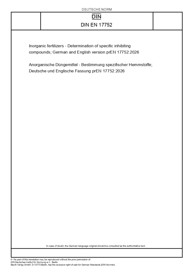 | Name: | Inorganic fertilizers - Determination of specific inhibiting compounds; German and English version prEN 17752:2026 |