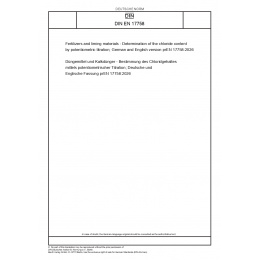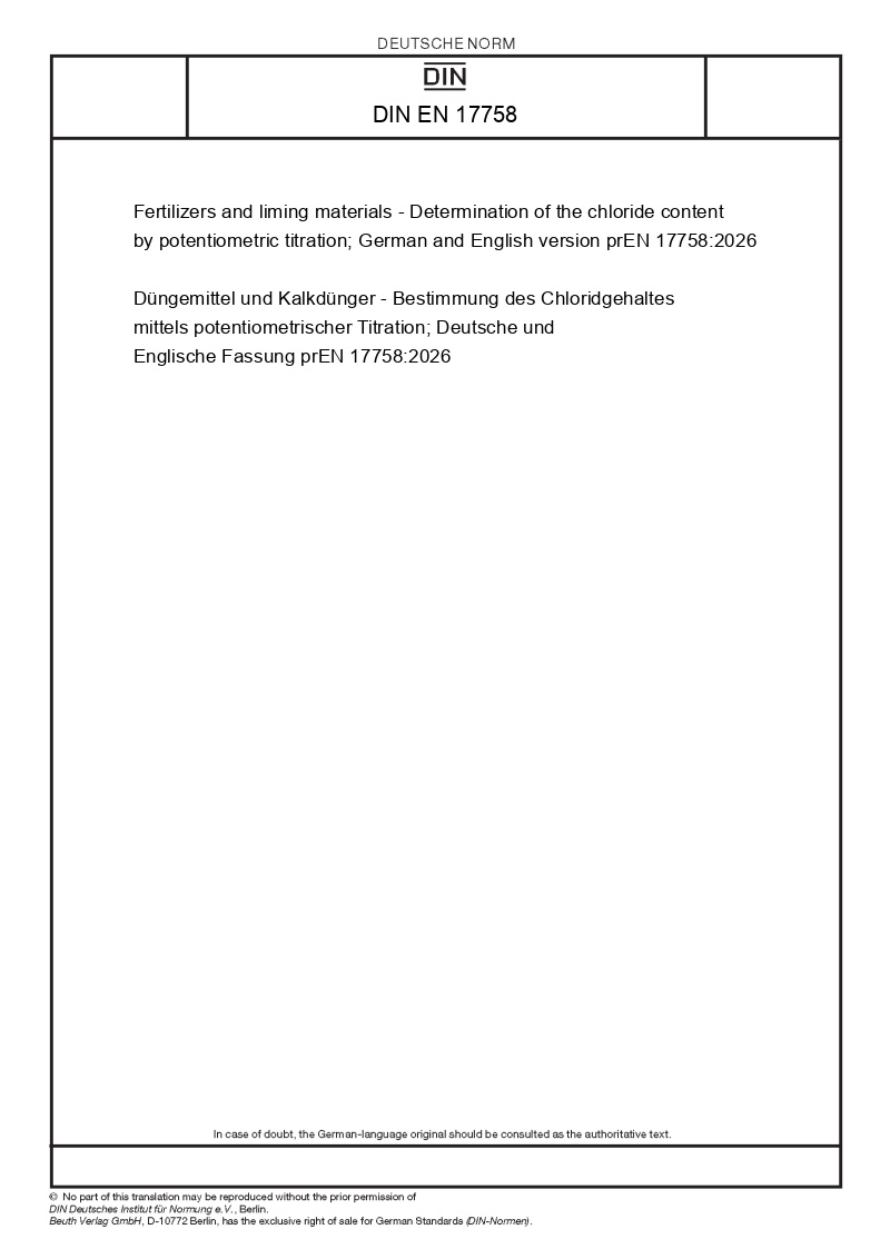 | Name: | Fertilizers and liming materials - Determination of the chloride content by potentiometric titration; German and English version prEN 17758:2026 |