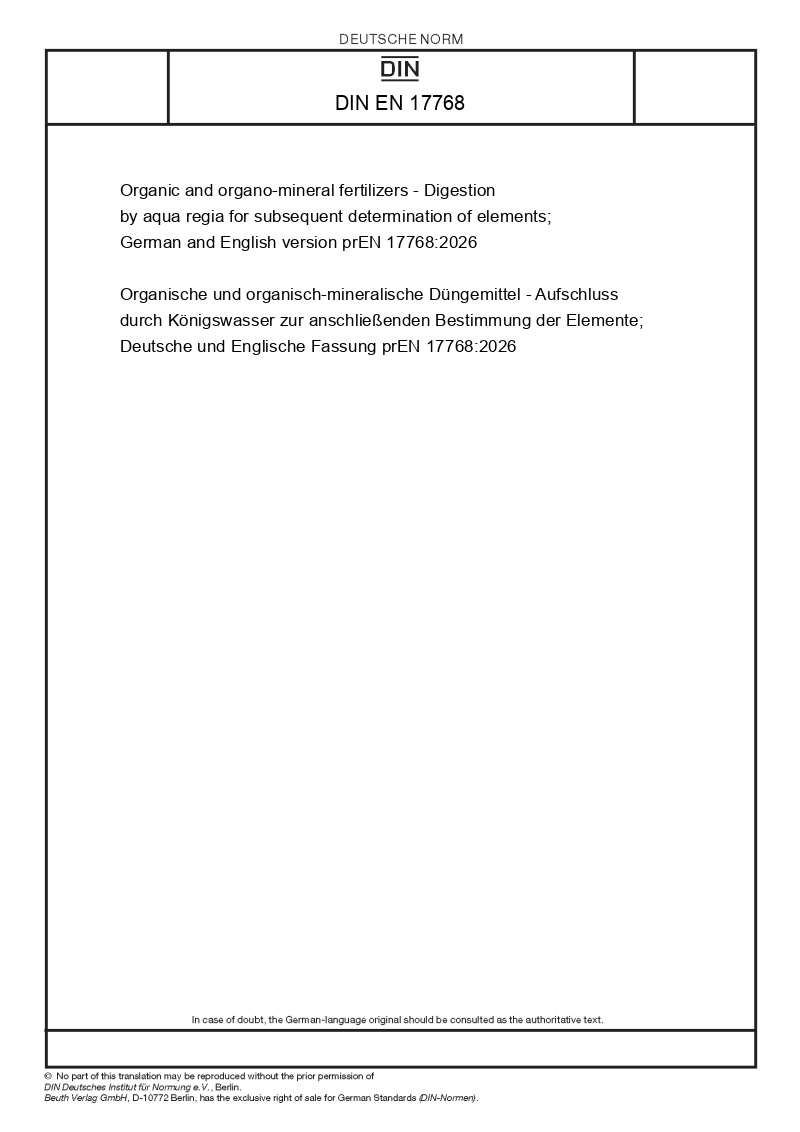 | Name: | Organic and organo-mineral fertilizers - Digestion by aqua regia for subsequent determination of elements; German and English version prEN 17768:2026 |