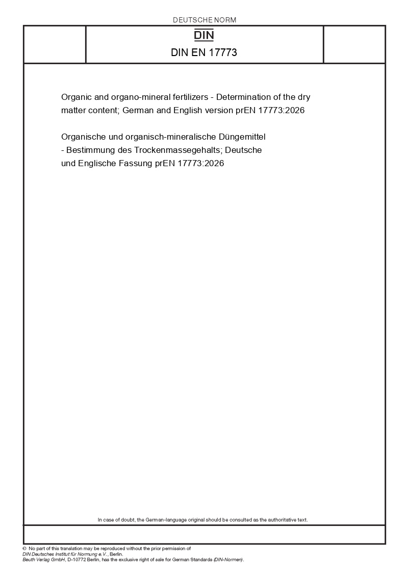 | Name: | Organic and organo-mineral fertilizers - Determination of the dry matter content; German and English version prEN 17773:2026 |