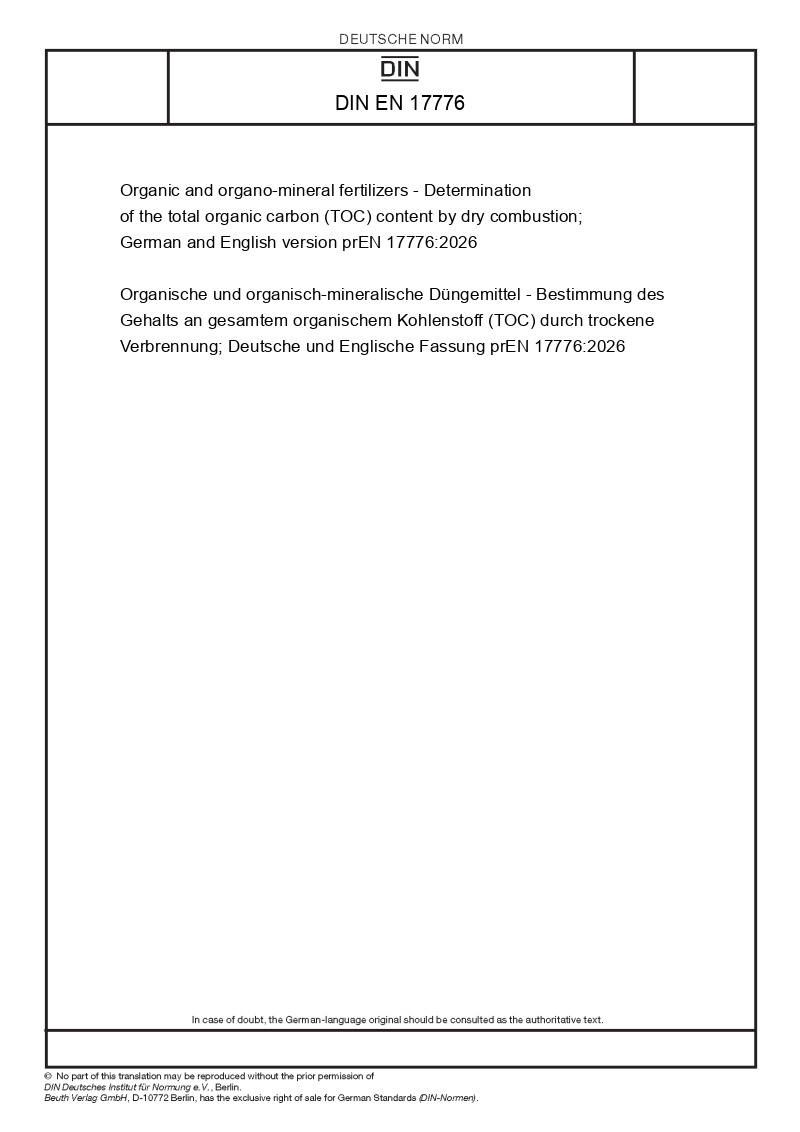 | Name: | Organic and organo-mineral fertilizers - Determination of the total organic carbon (TOC) content by dry combustion; German and English version prEN 17776:2026 |
