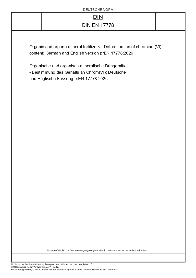 | Name: | Organic and organo-mineral fertilizers - Determination of chromium(VI) content; German and English version prEN 17778:2026 |
