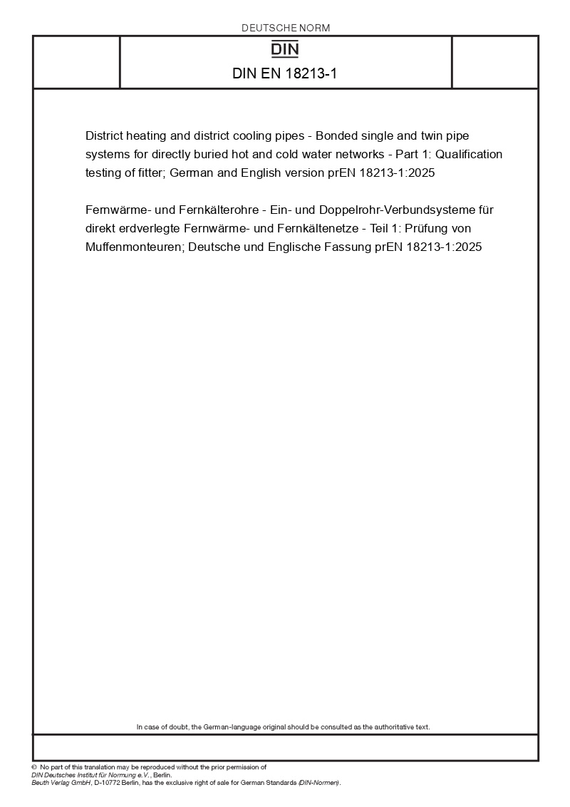 District heating and district cooling pipes - Bonded single and twin pipe systems for directly buried hot and cold water networks - Part 1: Qualification testing of fitter; German and English version prEN 18213-1:2025