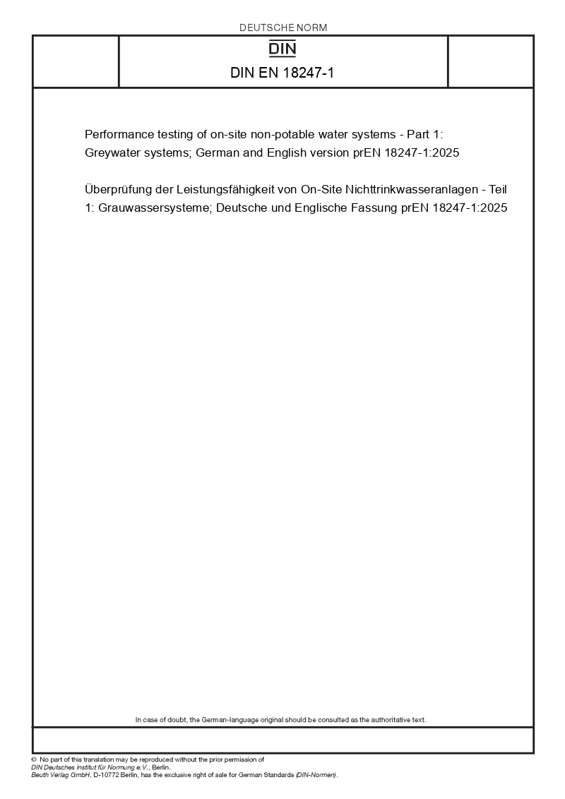 | Name: | Performance testing of on-site non-potable water systems - Part 1: Greywater systems; German and English version prEN 18247-1:2025 |