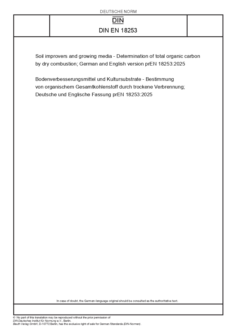Name: | Soil improvers and growing media - Determination of total organic carbon by dry combustion; German and English version prEN 18253:2025 |