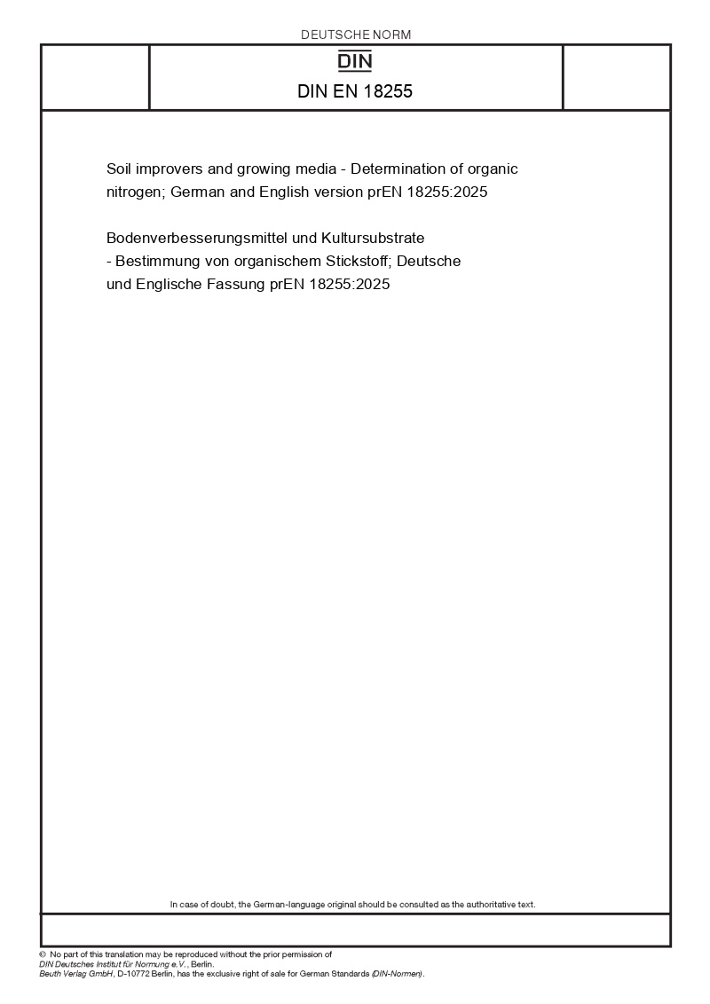 Name: | Soil improvers and growing media - Determination of organic nitrogen; German and English version prEN 18255:2025 |