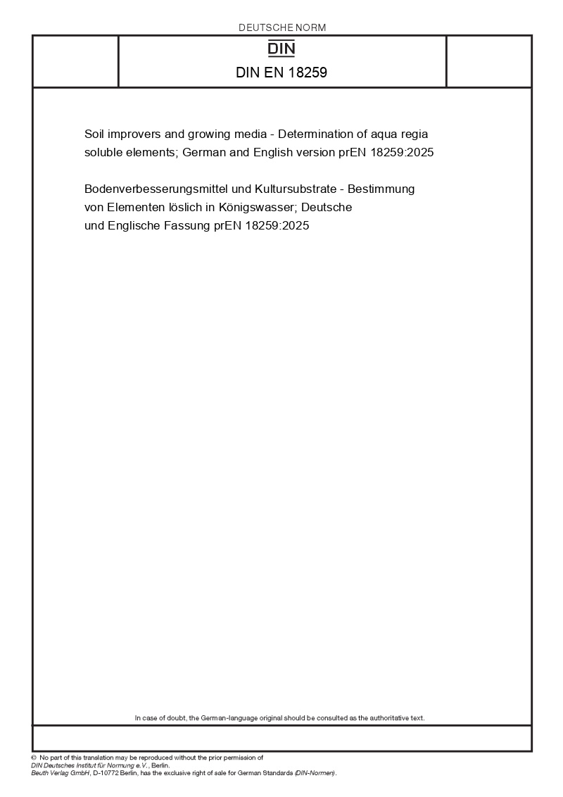 | Name: | Soil improvers and growing media - Determination of aqua regia soluble elements; German and English version prEN 18259:2025 |