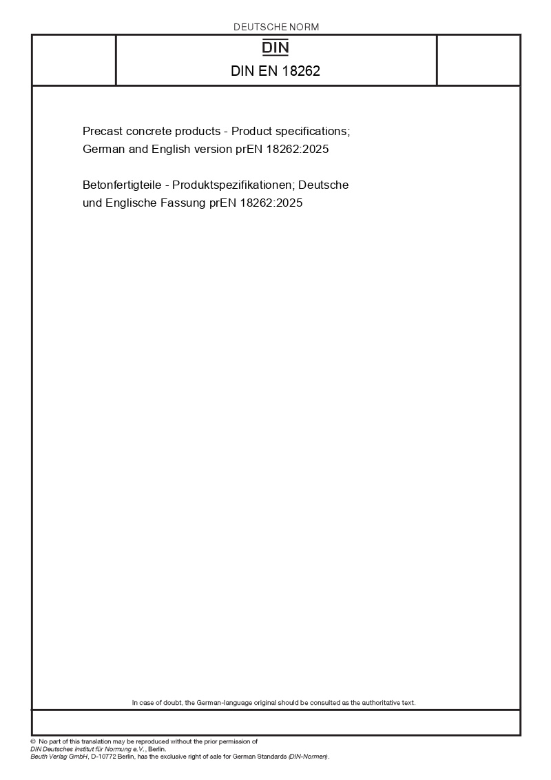 DIN EN 18262 Betonfertigteile - Produktspezifikationen; Deutsche und Englische Fassung prEN 18262:2025in stockReleased: 2025-12