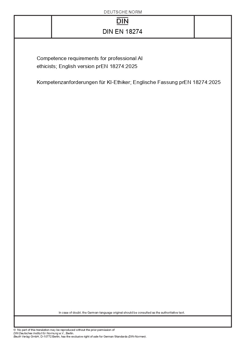 DIN EN 18274 Competence requirements for professional AI ethicists; English version prEN 18274:2025in stockReleased: 2025-11