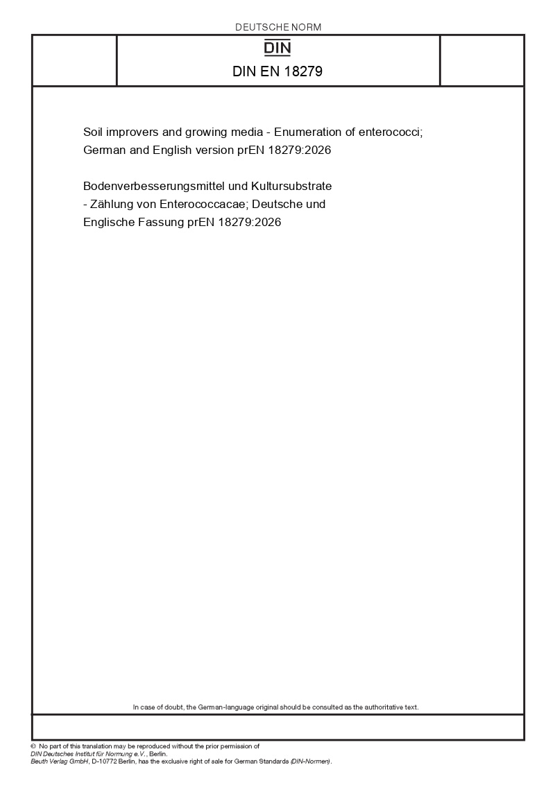 | Name: | Soil improvers and growing media - Enumeration of enterococci; German and English version prEN 18279:2026 |