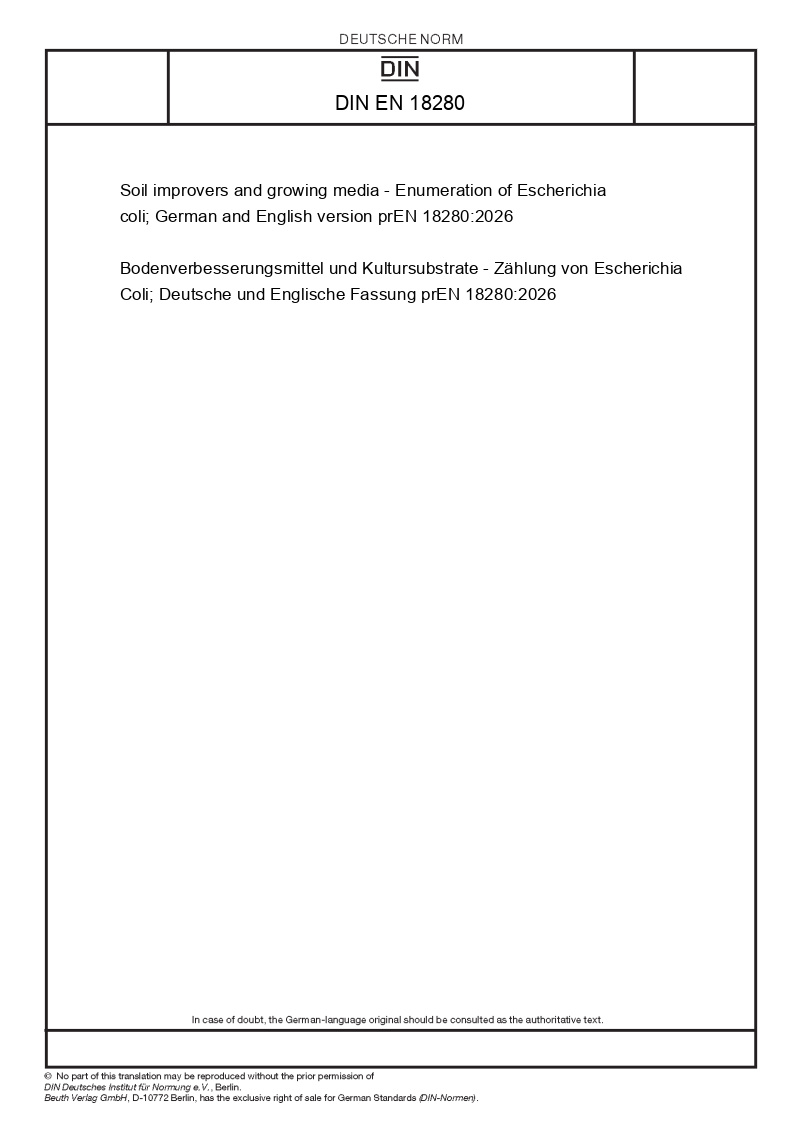 | Name: | Soil improvers and growing media - Enumeration of Escherichia coli; German and English version prEN 18280:2026 |