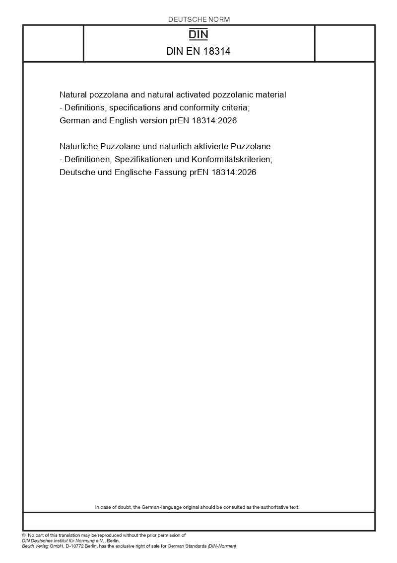 | Name: | Natural pozzolana and natural activated pozzolanic material - Definitions, specifications and conformity criteria; German and English version prEN 18314:2026 |