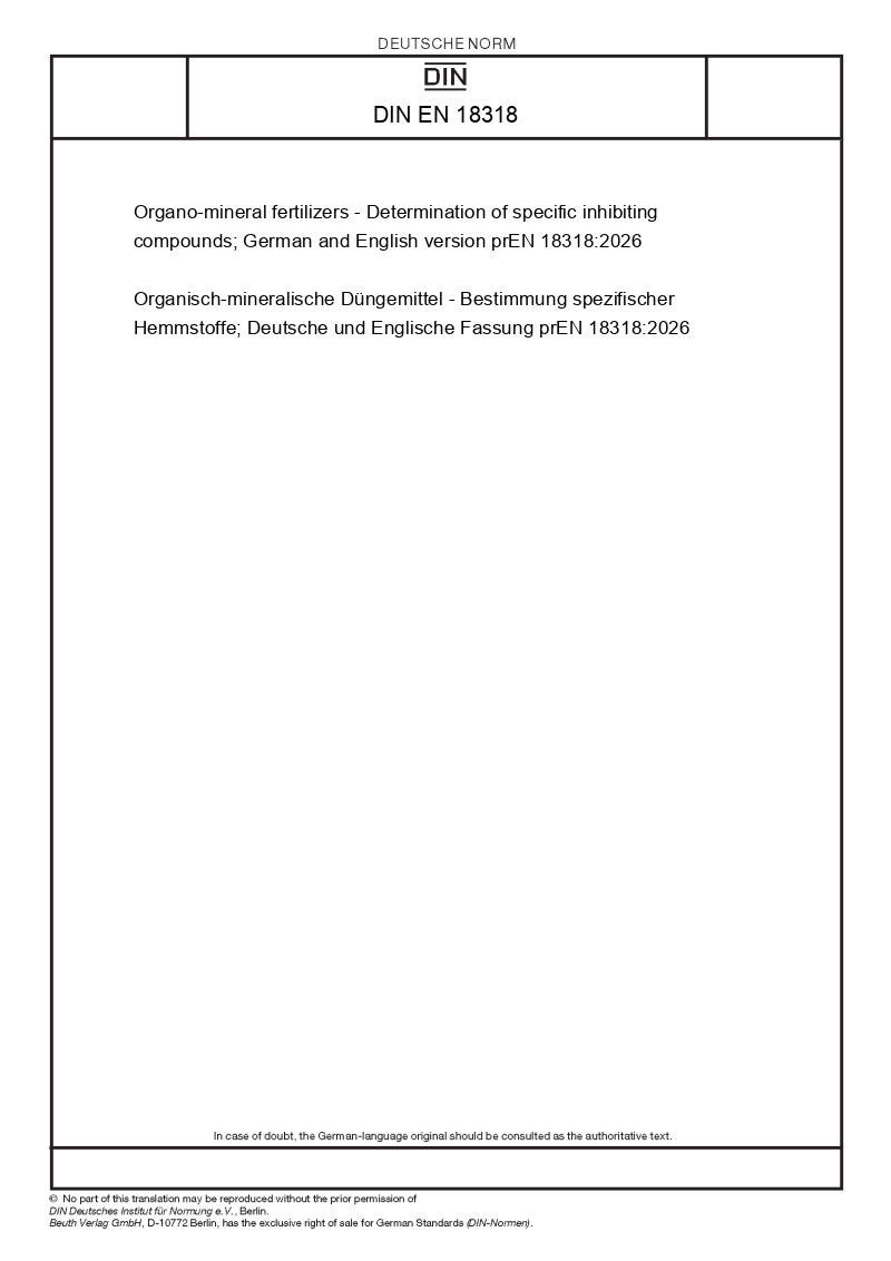 | Name: | Organo-mineral fertilizers - Determination of specific inhibiting compounds; German and English version prEN 18318:2026 |