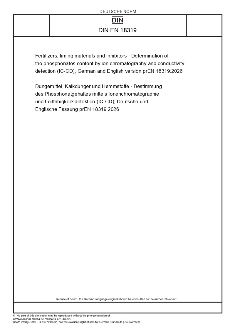 | Name: | Fertilizers, liming materials and inhibitors - Determination of the phosphonates content by ion chromatography and conductivity detection (IC-CD); German and English version prEN 18319:2026 |